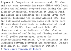 During the warm Bølling-Allerød (BA) interstadial (a warmer time period) about 15,000 to 13,000 years ago, the climate was temperate and mesic, as evidenced by the appearance of pollen of temperate deciduous oak (Quercus spp.) and pollen and macrofossils of the moisture-loving balsam fir (Abies balsamea). The char MARs during this time showed a slow increase and peaked at the end of the interstadial when temperate oak species became more abundant and boreal spruce (Picea spp.) declined. The colder, wet Younger Dryas (YD) period that followed was also characterized by high char MARs, but with some occasional troughs, and the char MARs showed a peak at the end of the YD when boreal trees, including larch (Larix laricinaPicea, and Abies balsamea abruptly disappeared.